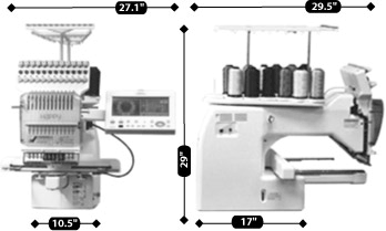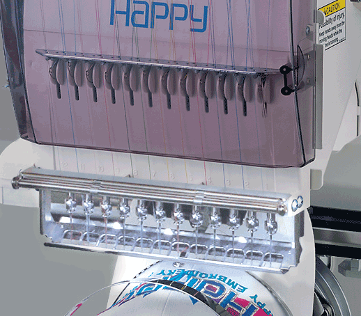 | Flash Memory Accepts USB "Jump" drives or Compact Flash memory cards up to 1Gb. |  | Connection Ports Serial, USB and LAN ports. Networkable! |  | Bobbin Winder Built-in - runs independently of the machine sewing. Color match both sides of your embroidery! |  | Durable Construction Die cast metal frame, strong drive system for long machine life - proven after years in the field! | | ADDITIONAL FEATURES | • Networkable - capability built in to each machine • Accepts popular 3rd-party hoop & clamp systems • Surprisingly quiet operation • Holds up to 99 designs or 259,000 stitches • Limited 5-year warranty • Built-in lettering, holds 99 designs • Match to HAPPY hoops or custom hoops on screen | |  | machine dimensions | | |  |  | Accepts Popular Flash Memory Devices | 12/08: Enhanced lighting in needle area ! | | | |